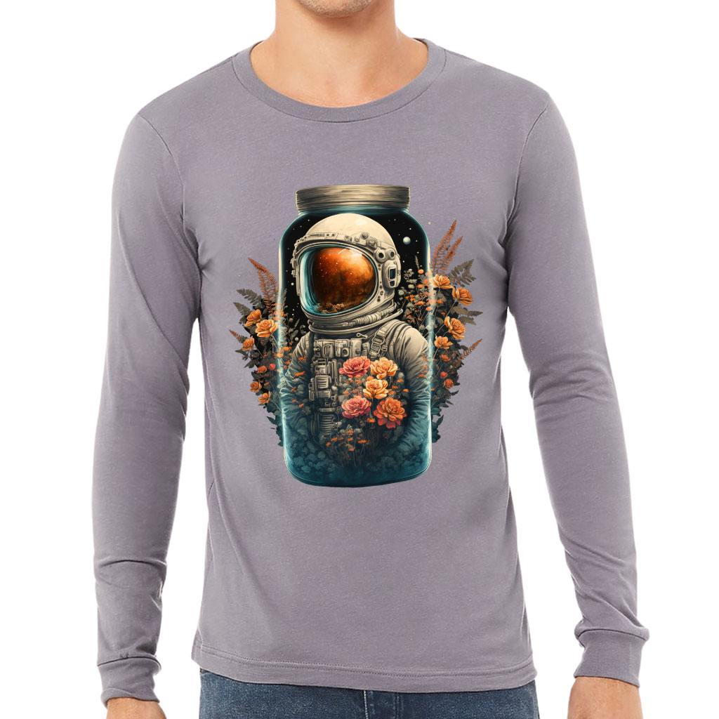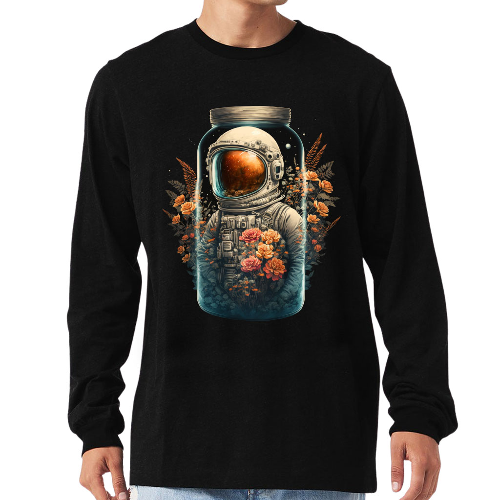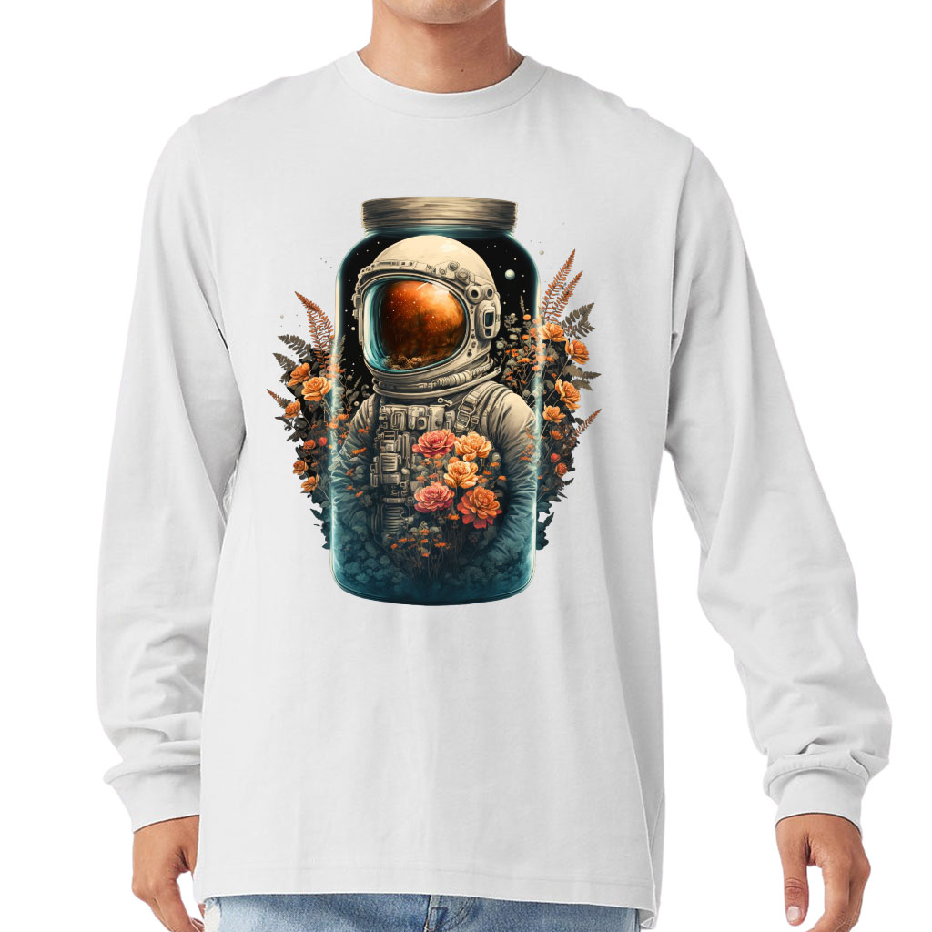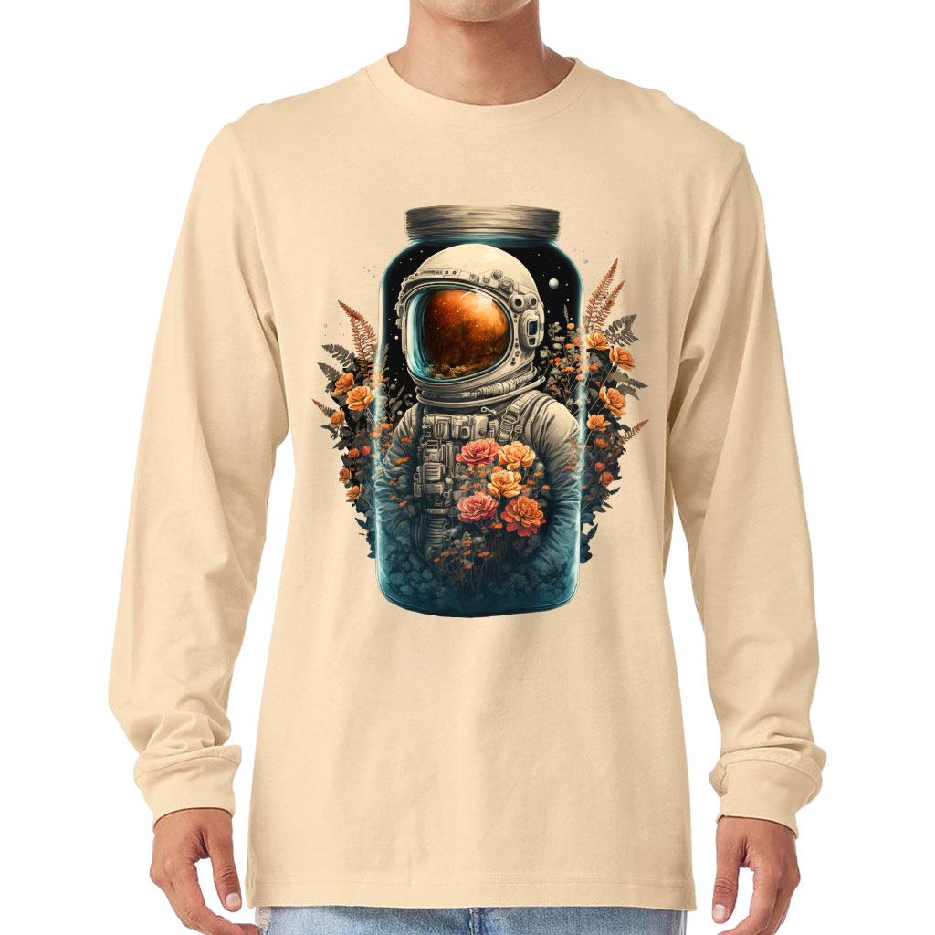 Astronaut Print Long Sleeve T-Shirt is proudly made with 7x less water than average manufacturers, in recycle-friendly facilities that also guarantee zero sweatshop conditions. Floral is designed and printed in California.