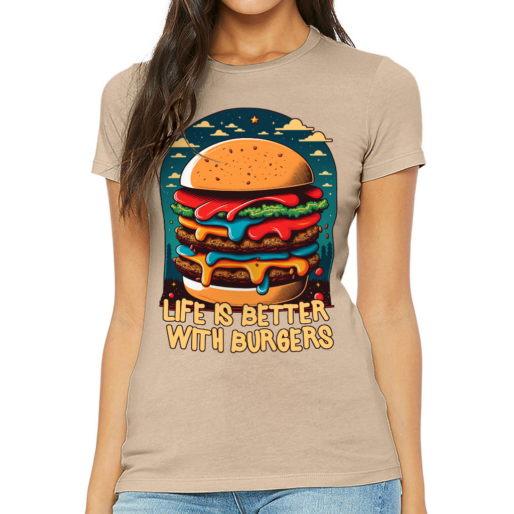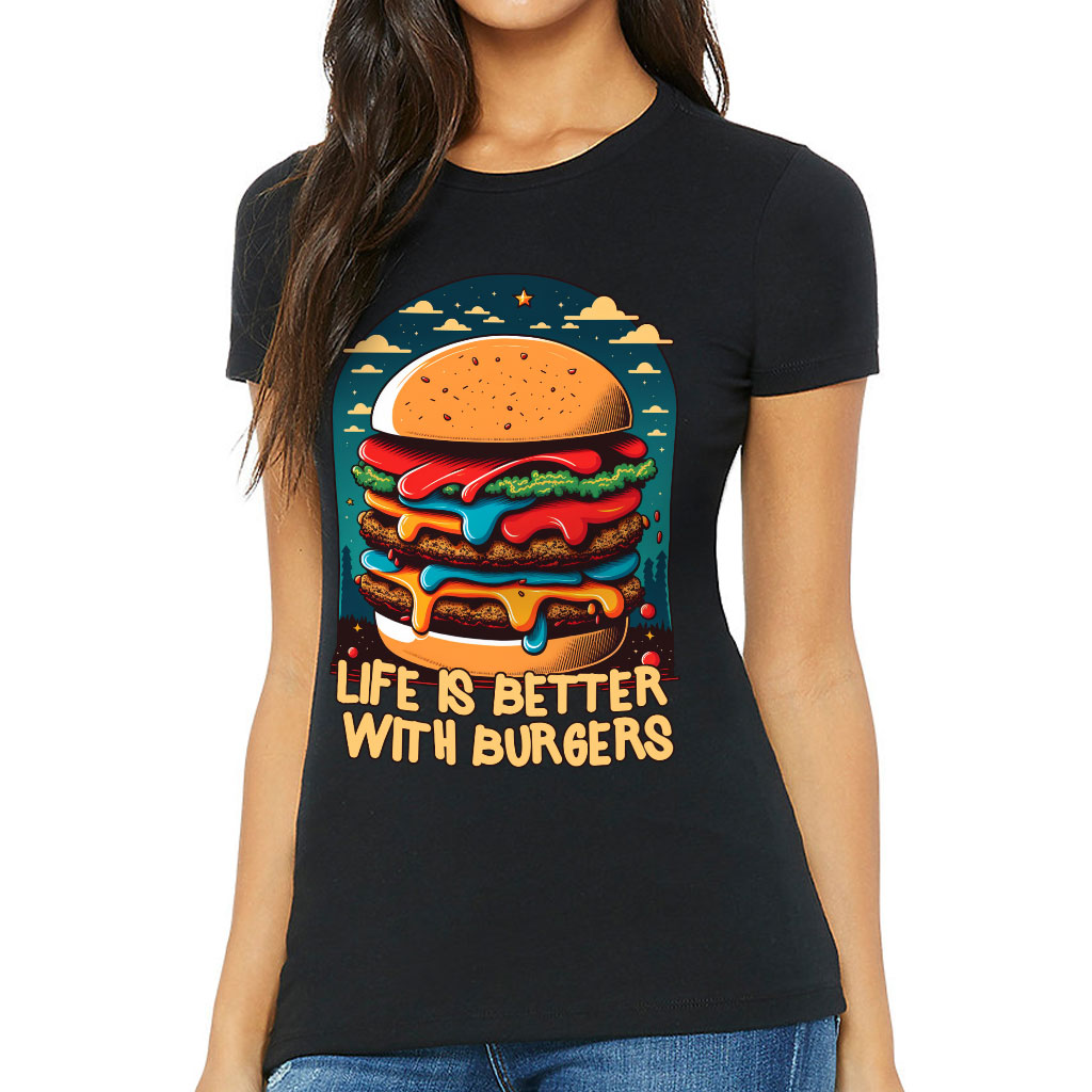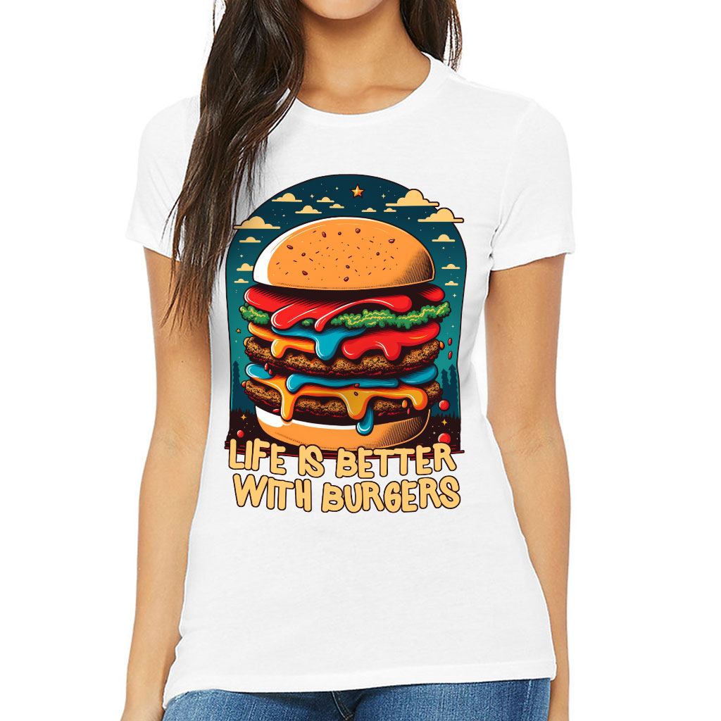 See why people love Burger Print Slim Fit T-Shirt – Quote Women’s T-Shirt – Illustration Slim Fit Tee