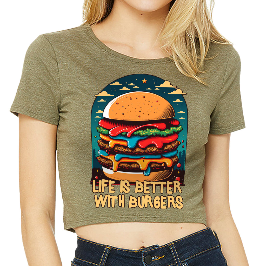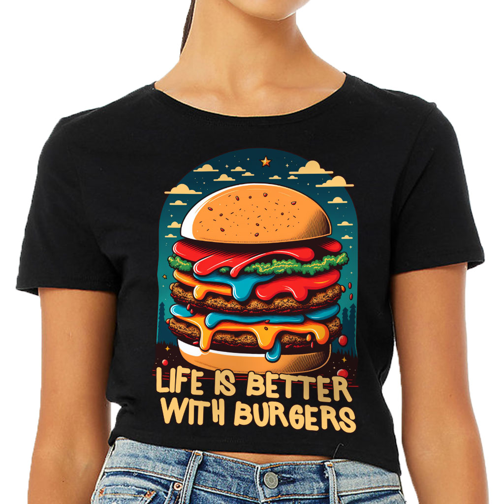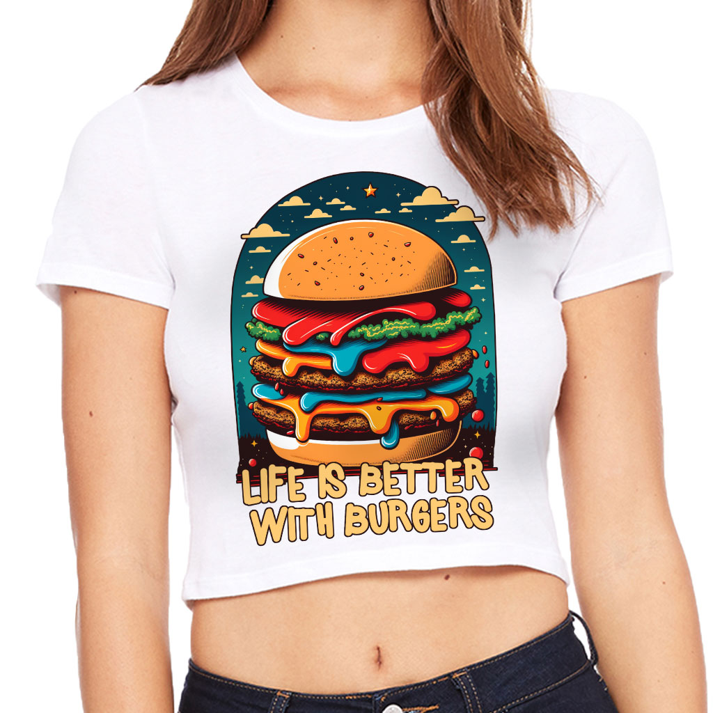 Burger Print Women’s Cropped T-Shirt is no ordinary piece of clothing. Its form-fitting silhouette and soft fit and feel provide a retail fit for clothing that’s true to size.