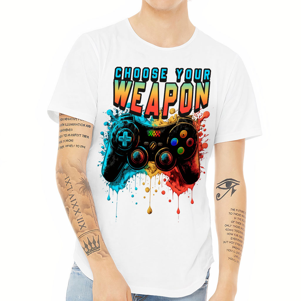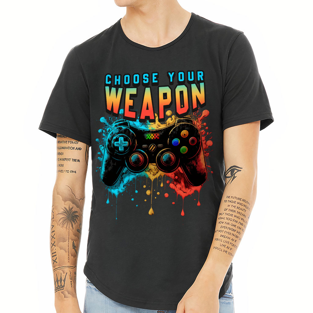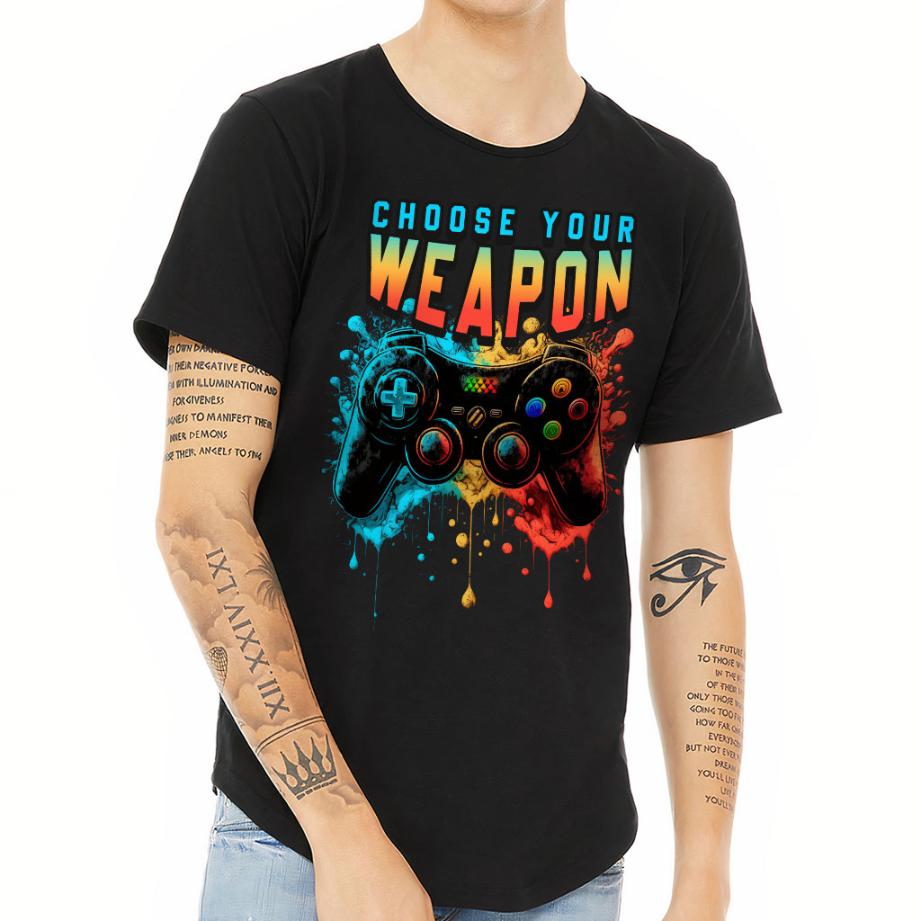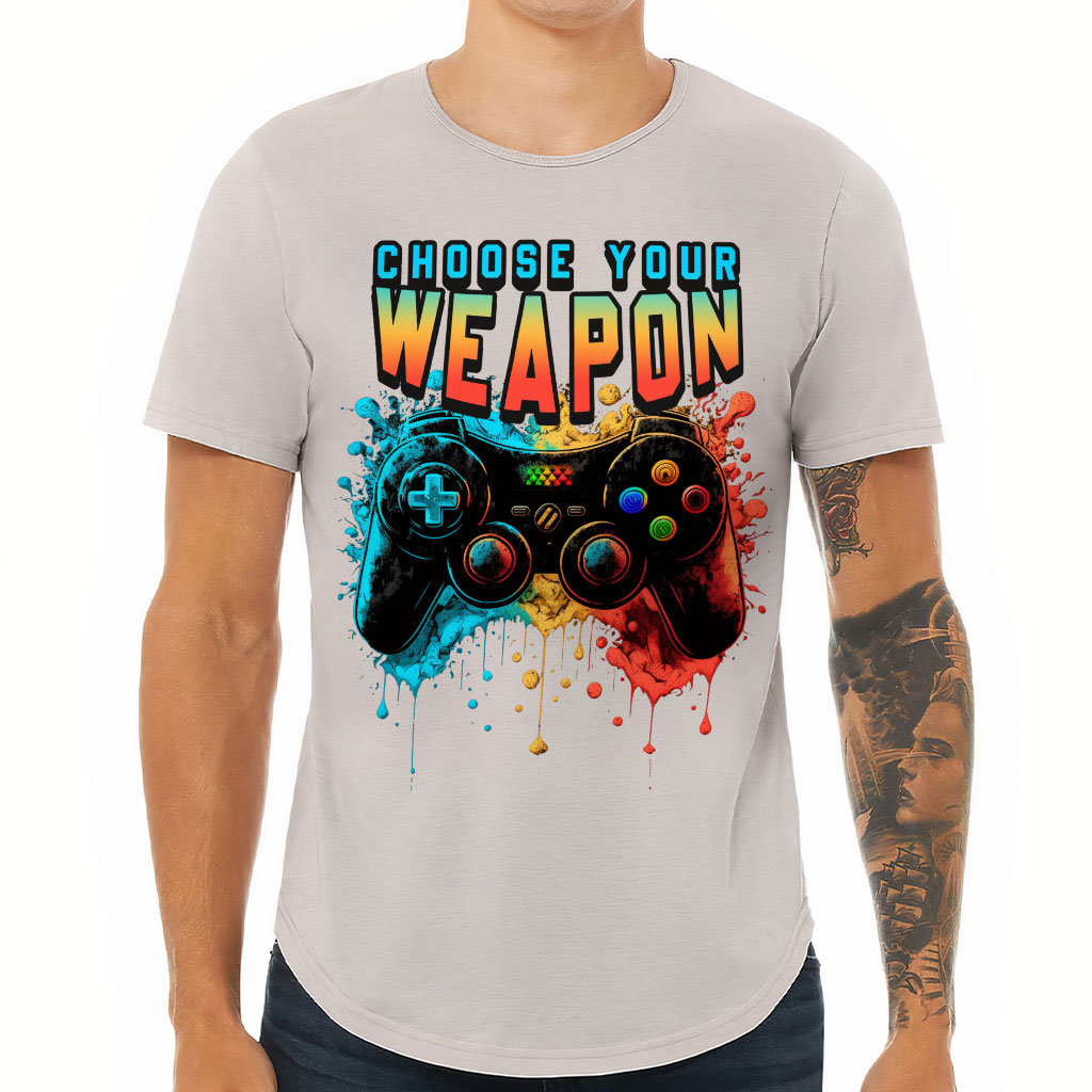 Choose Your Weapon Curved Hem T-Shirt Looking for a stylish and comfortable t-shirt that you can wear on any day? Check out Gamer! Cool Art  is perfect for men who want to look good and feel comfortable at the same time. The curved hem gives this shirt a unique and trendy…