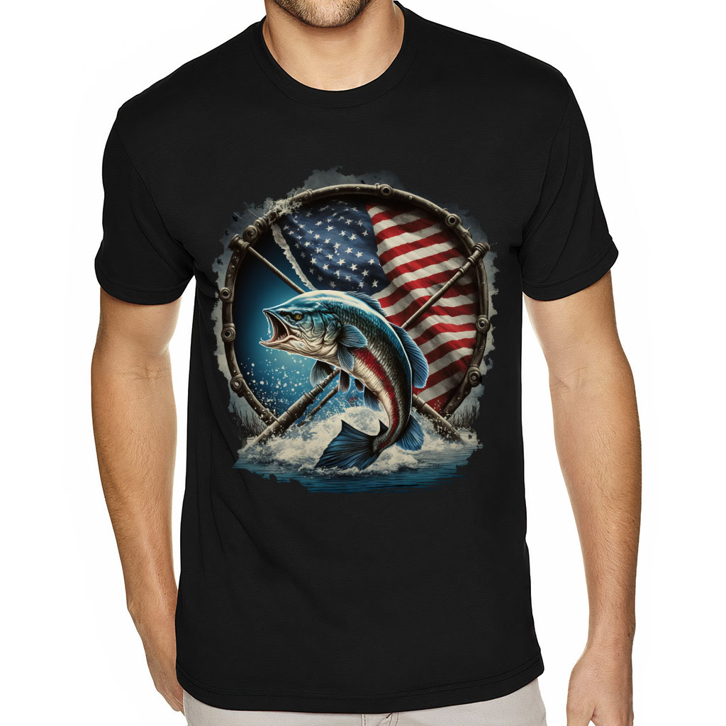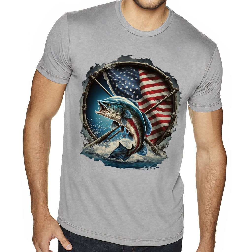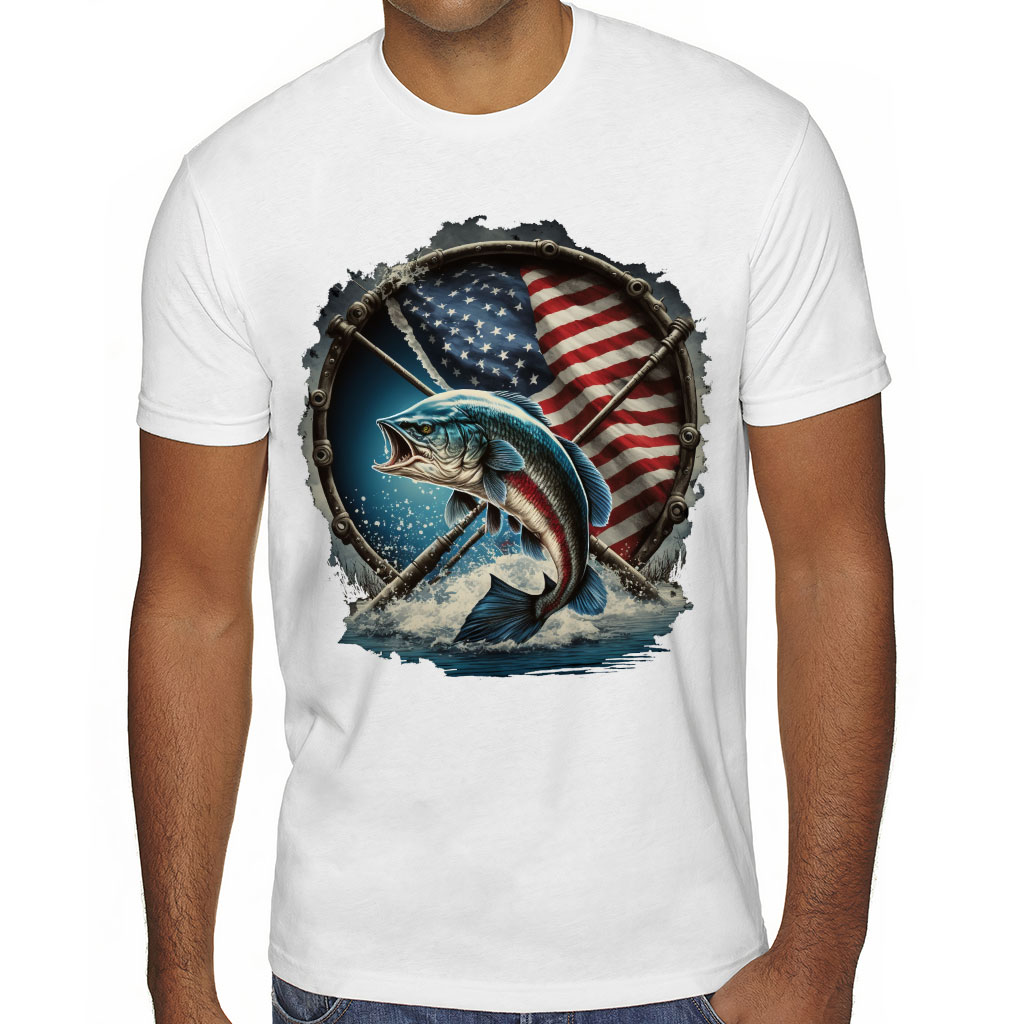 Flag Behind Bass Fishing Sueded T-Shirt – Patriotic T-Shirt – Cool Sueded Tee