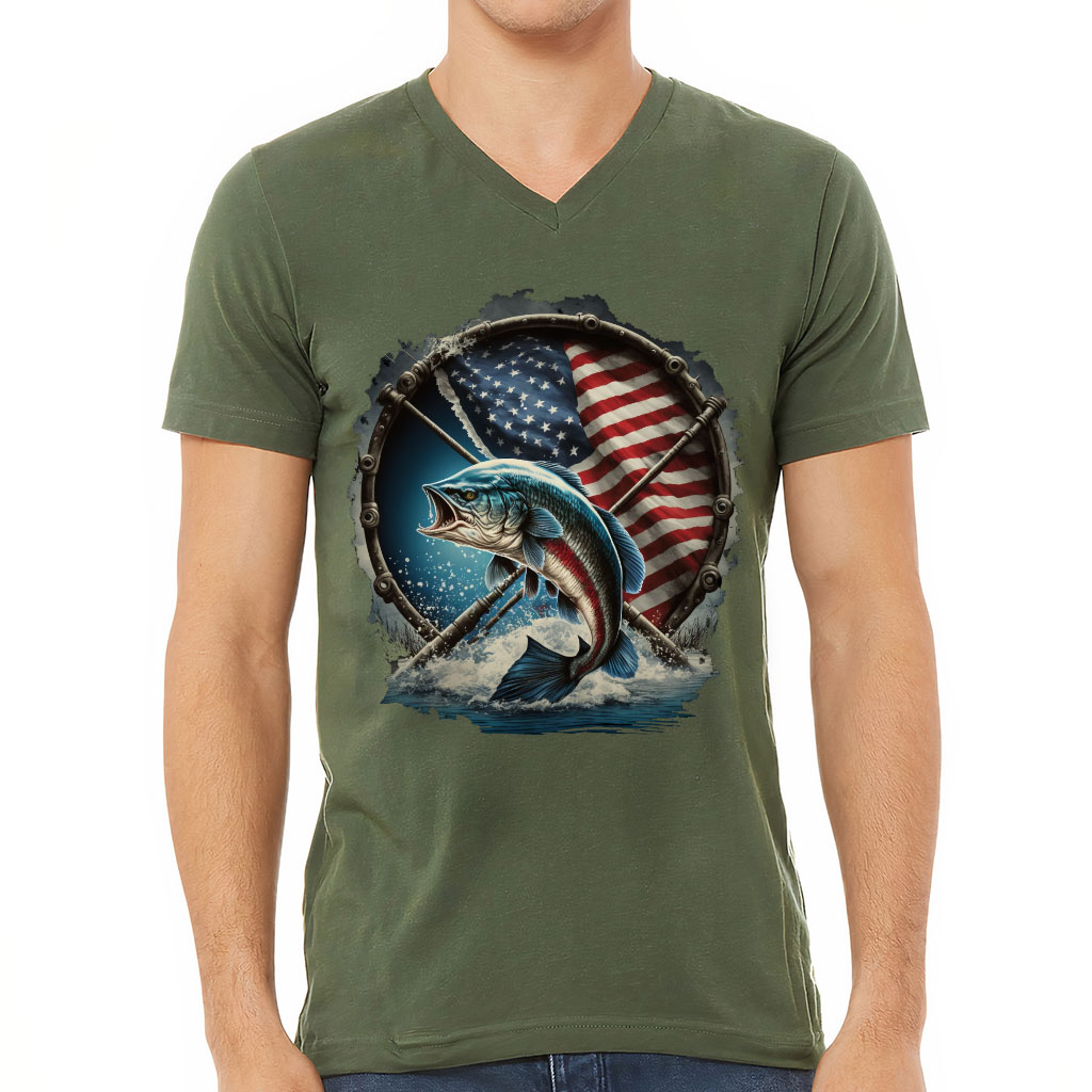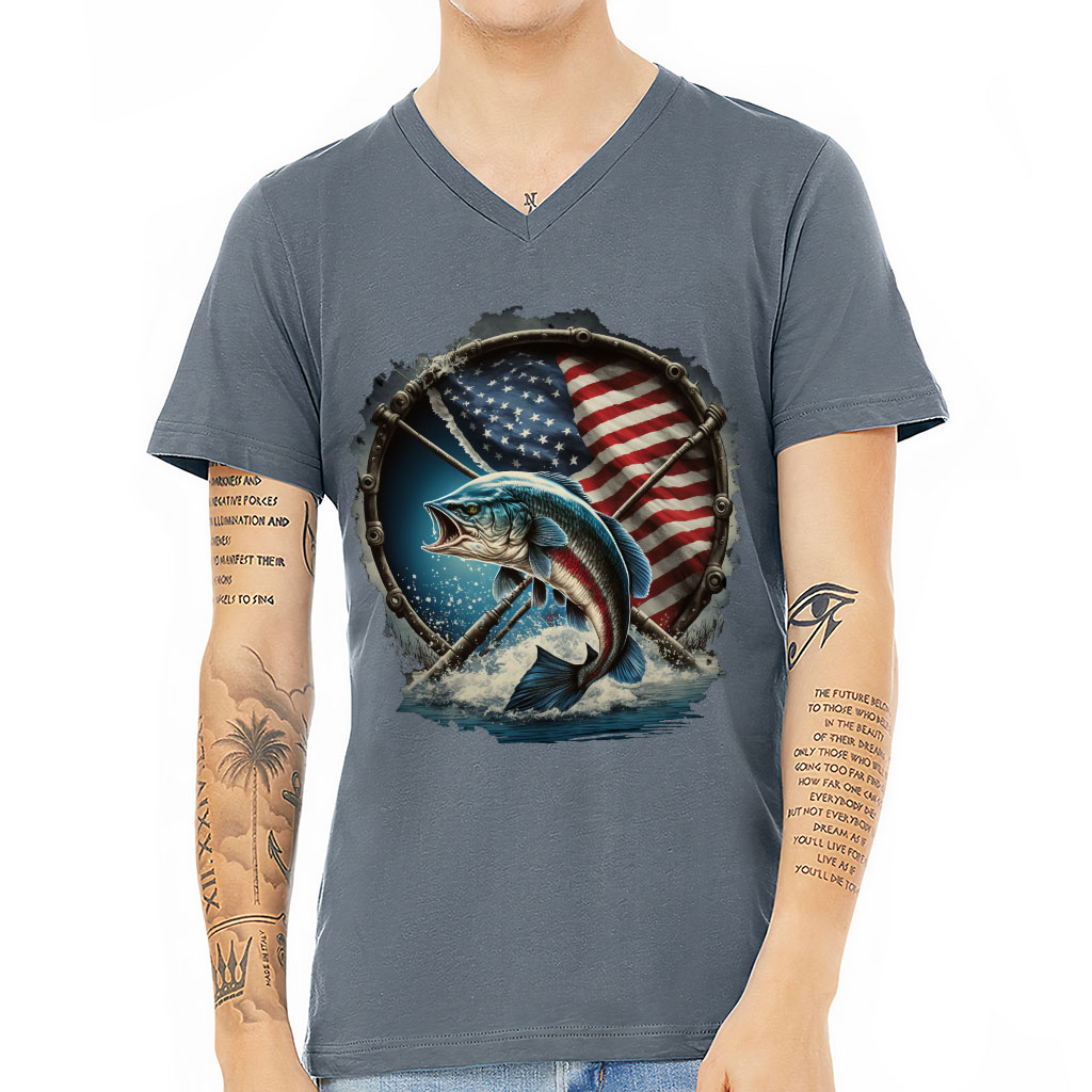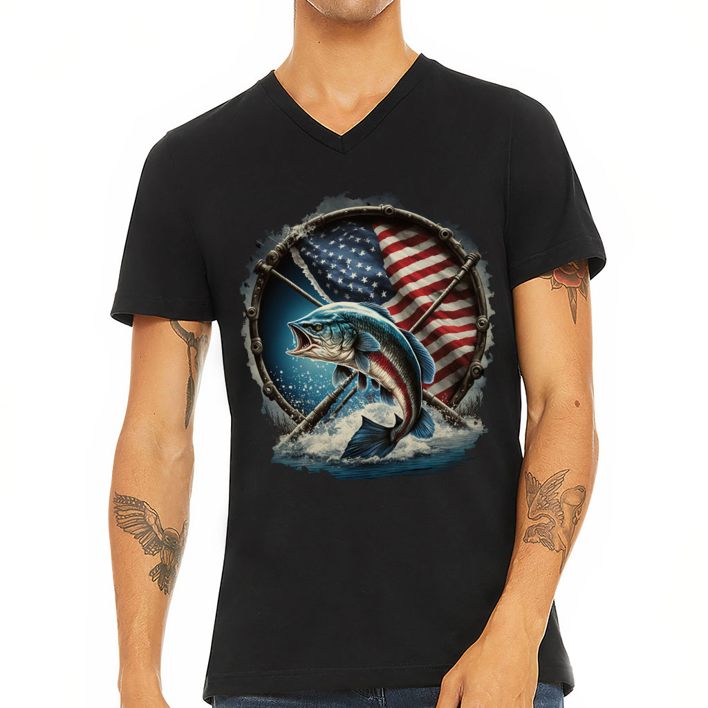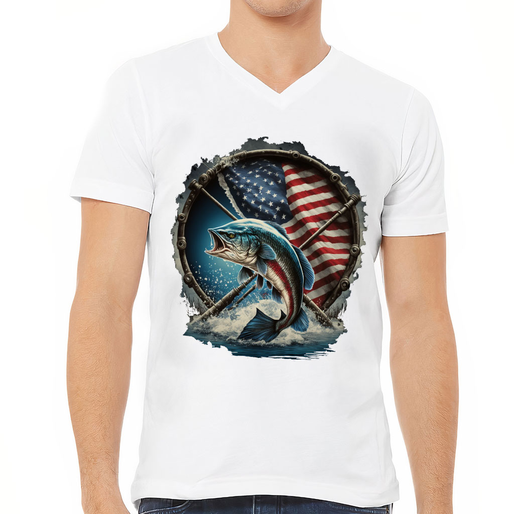 Flag Behind Bass Fishing V-Neck T-Shirt – Patriotic T-Shirt – Cool V-Neck Tee