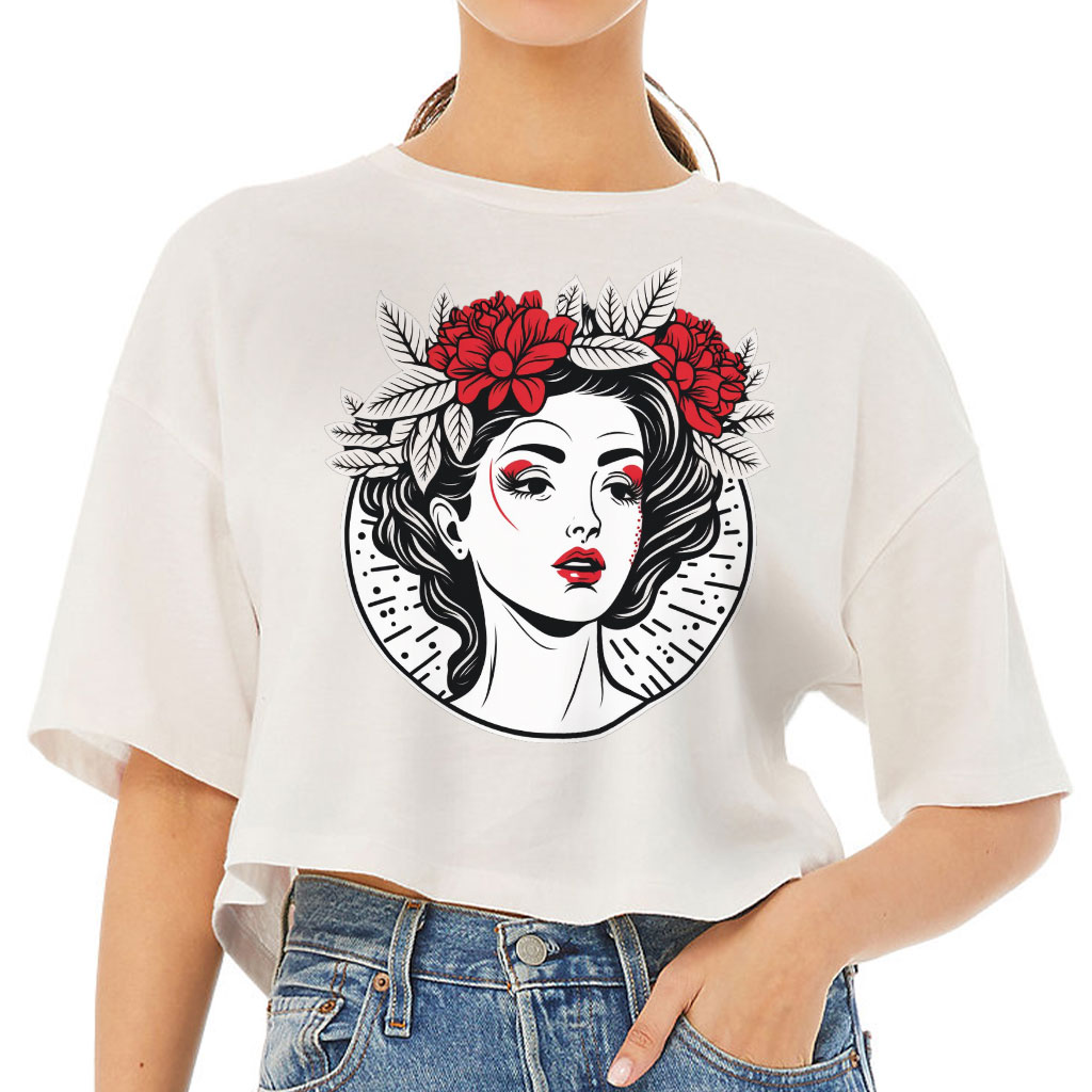 Floral Design Women’s Crop Tee Shirt has a great look and cool fit. No matter what time of the year it is, you have a shirt for it all! This cropped t-shirt is the perfect way to make a statement. This t-shirt is made of soft cotton, which will not easily deform, and is breathable as well as comfortable, making you feel comfy all day.