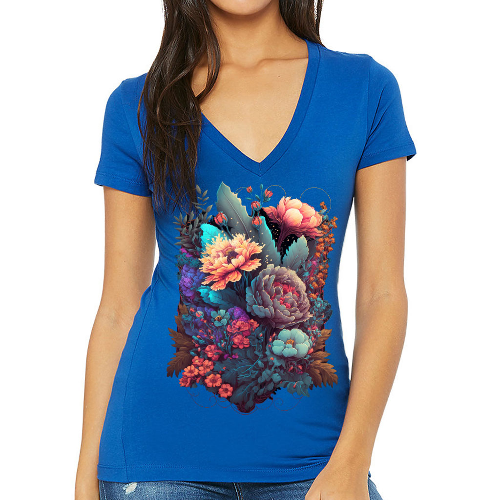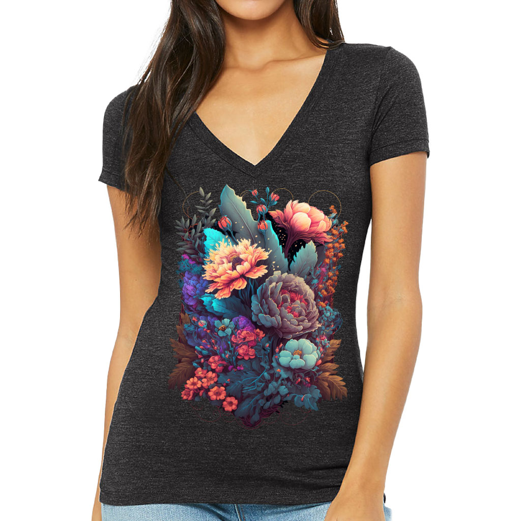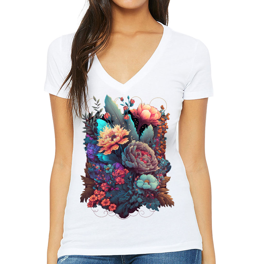 Flower Graphic Women’s V-Neck T-Shirt – Cute V-Neck Tee – Digital Art T-Shirt