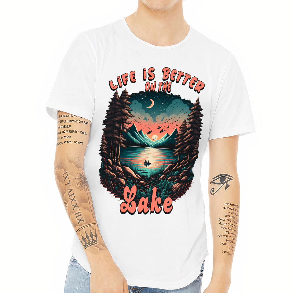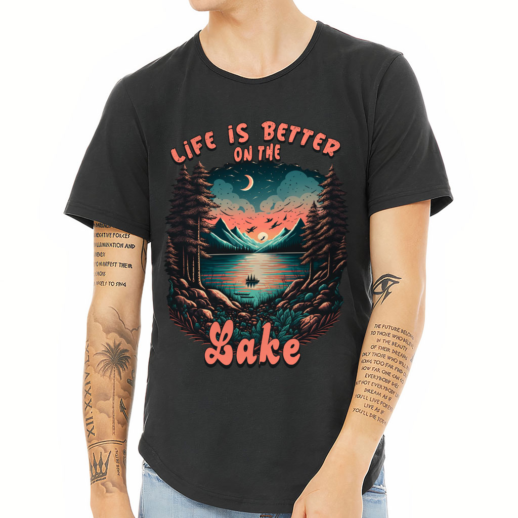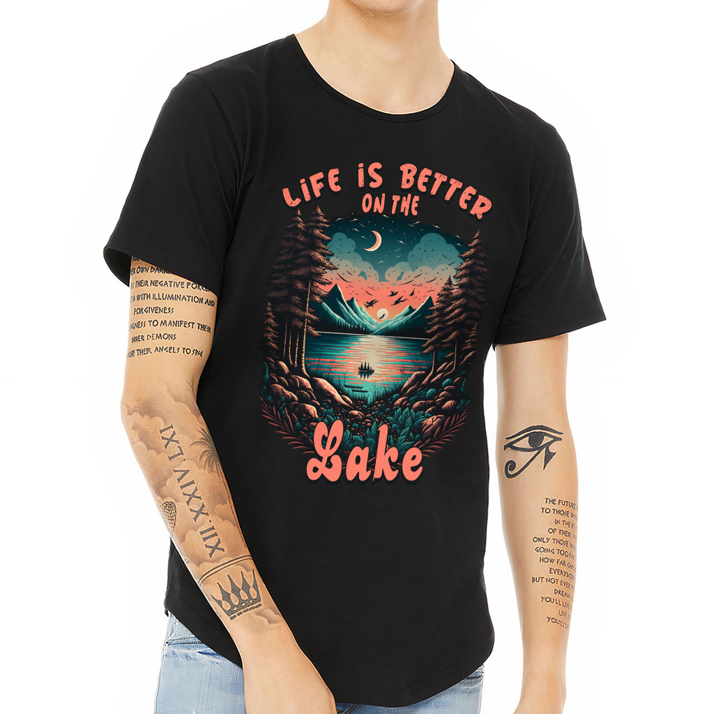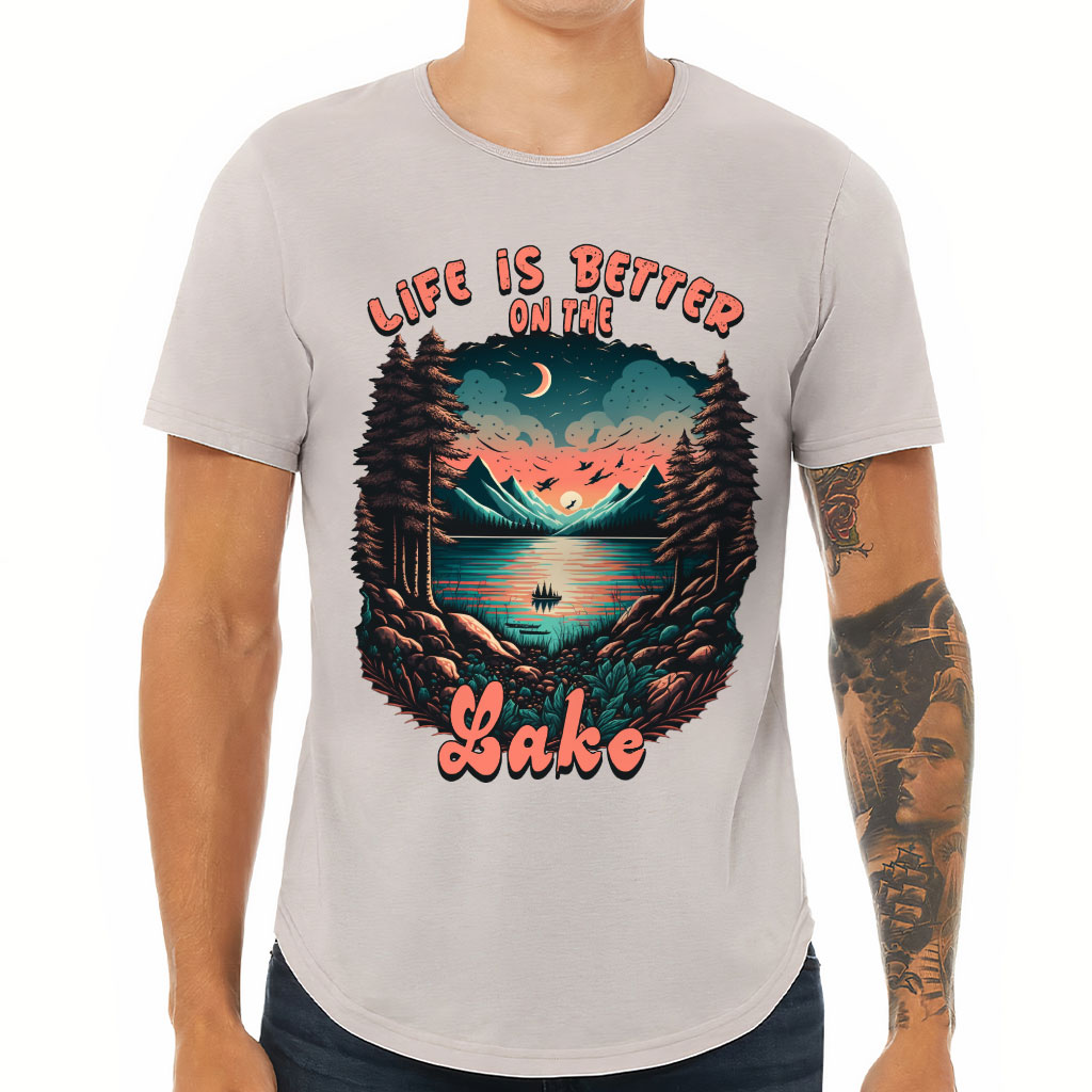Life is Better at the Lake Curved Hem T-Shirt is no ordinary piece of clothing. Its 3/8 neck binding, subtle