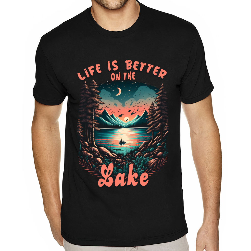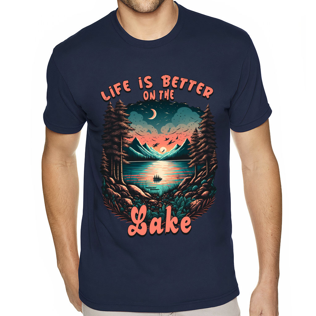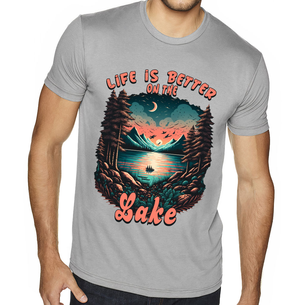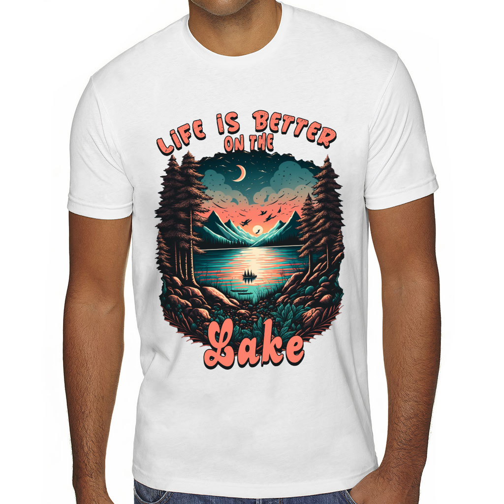 See why people love Life is Better at the Lake Sueded T-Shirt – Nature T-Shirt – Landscape Sueded Tee