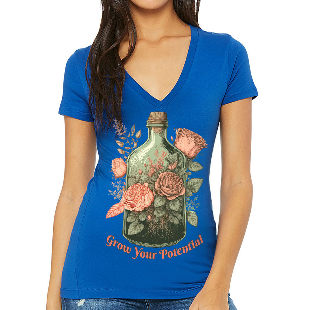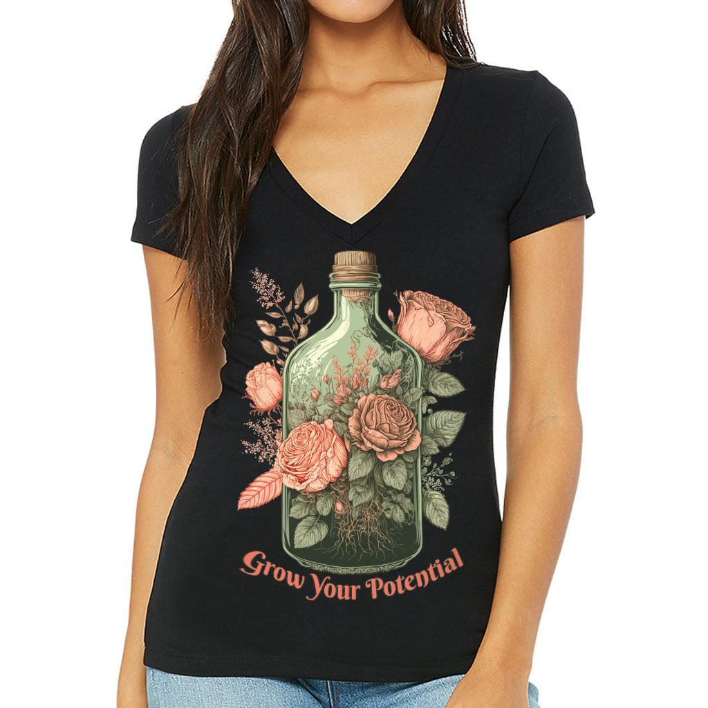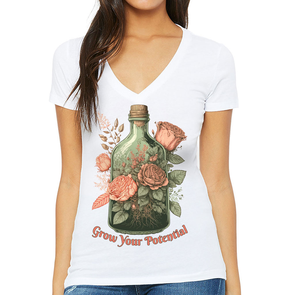 Roses Women’s V-Neck T-Shirt – Grow Your Potential V-Neck Tee – Graphic T-Shirt