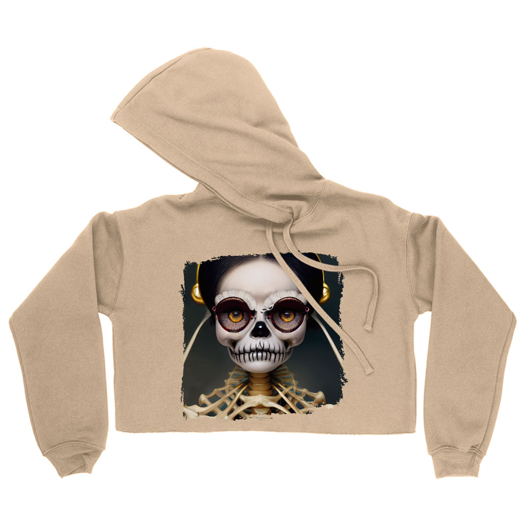 Skeleton Print Women’s Cropped Fleece Hoodie – Halloween Themed Cropped Hoodie for Women – Creepy Girl Hooded Sweatshirt