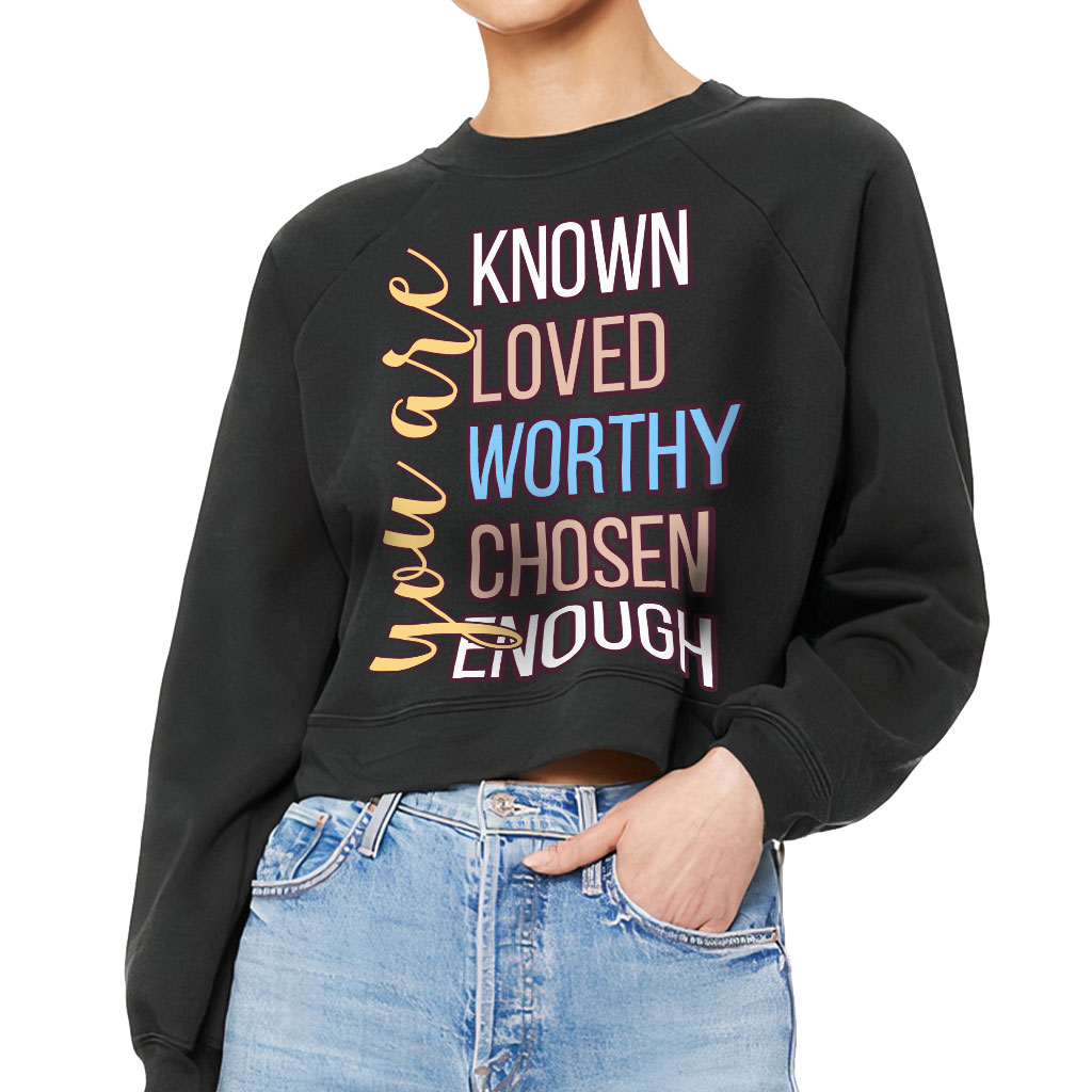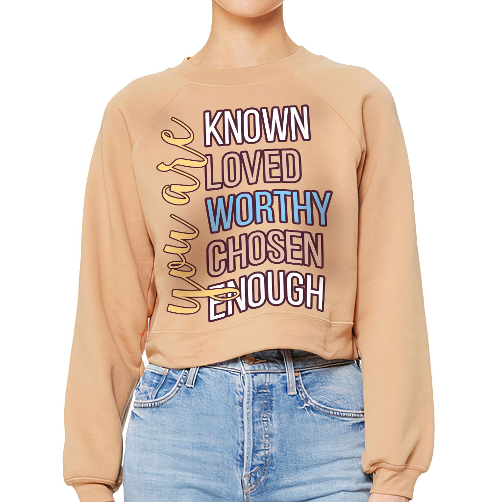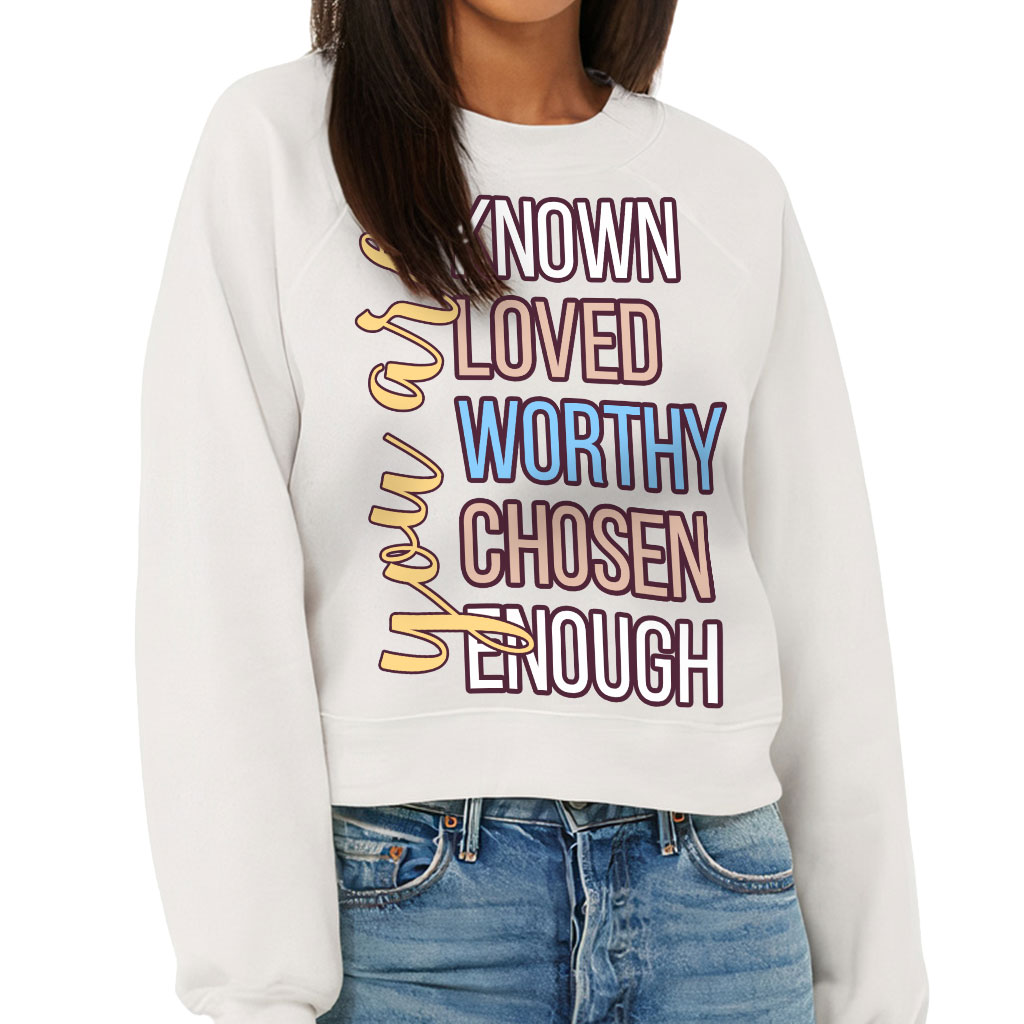 You are Loved Raglan Pullover Looking for some cozy comfort? Inspirational is just what you need! With contoured seaming on the raglan sleeves, it’s perfect for those lazy days, but stylish enough for heading out and about. This mid-length classic, made with our favorite sponge fleece, has a flattering neck bind…